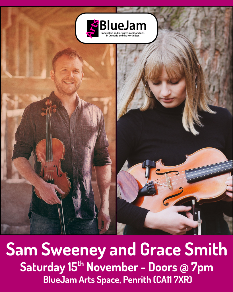 On Saturday 15th November (doors 7pm) we’re delighted to be hosting a gig with Sam Sweeney and Grace Smith. Sam and Grace are two of England’s leading fiddle players, known for their powerful, expressive playing and deep connection to traditional music. Sam, a BBC Folk Award winner and veteran of Bellowhead and Leveret, has been called “Britain’s Premier Fiddler” (Songlines), while Grace, a rising star with her acclaimed trio and work with Katie Doherty & the Navigators, brings a fresh, creative voice to the tradition. Both are passionate educators and innovative performers, combining archive inspiration with new compositions to create music that is richly rooted and boldly contemporary.
